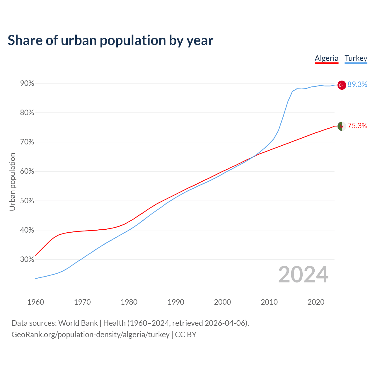 From 2004 to 2024, the share of urban population changed from 62.9% to 75.3% in Algeria and from 62.4% to 89.3% in Turkey.