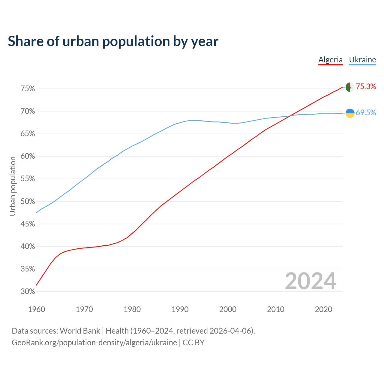 From 2004 to 2024, the share of urban population changed from 62.9% to 75.3% in Algeria and from 67.6% to 69.5% in Ukraine.
