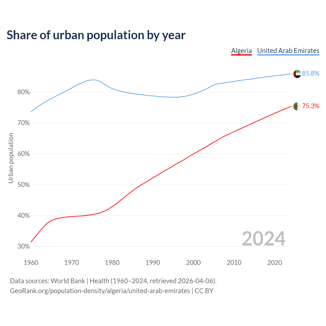 From 2004 to 2024, the share of urban population changed from 62.9% to 75.3% in Algeria and from 81.5% to 85.8% in the United Arab Emirates.