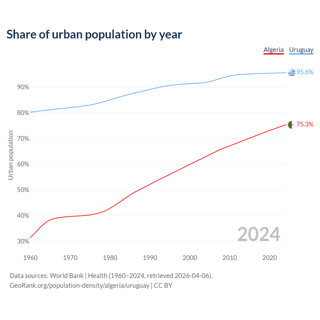 From 2004 to 2024, the share of urban population changed from 62.9% to 75.3% in Algeria and from 91.8% to 95.6% in Uruguay.