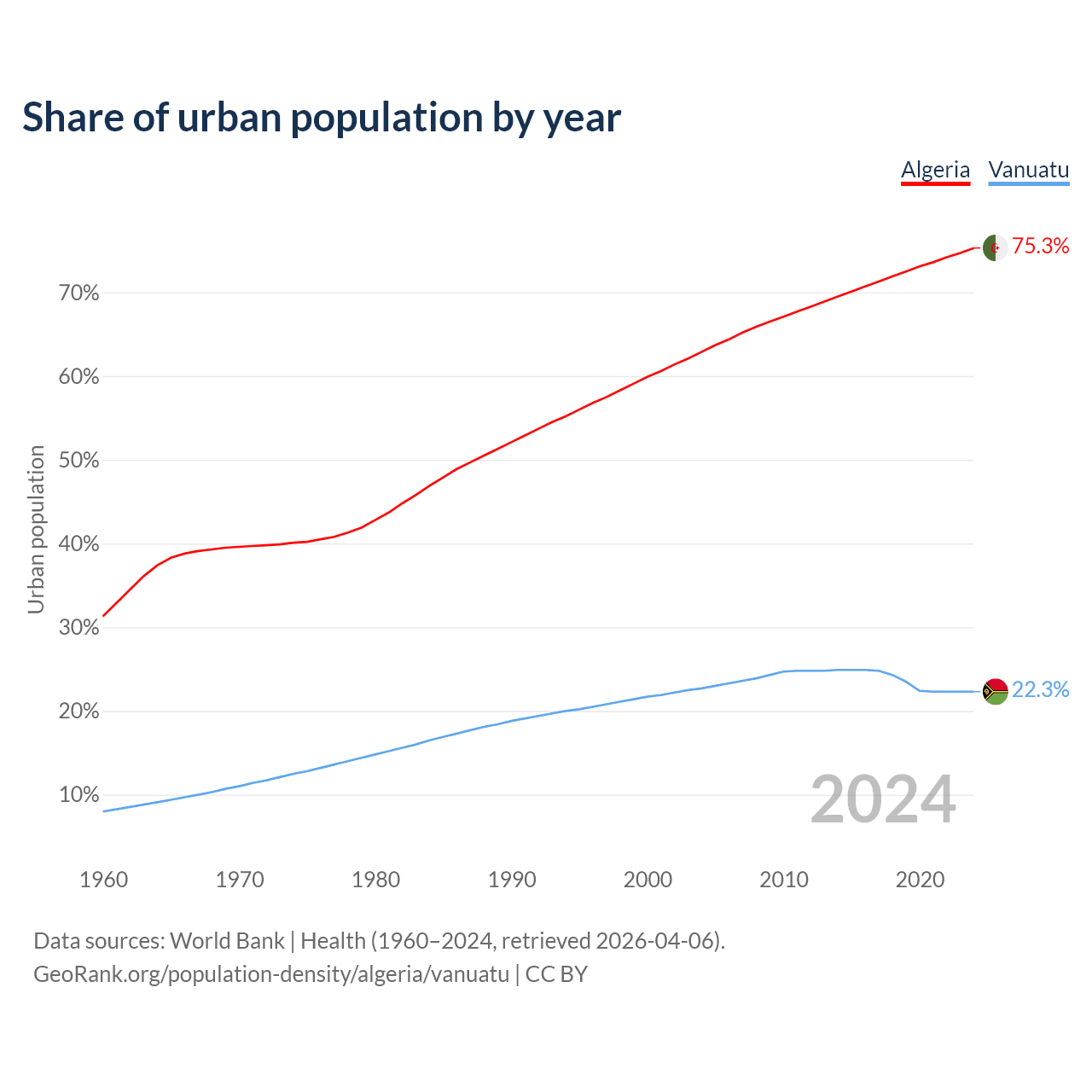 From 2004 to 2024, the share of urban population changed from 62.9% to 75.3% in Algeria and from 22.7% to 22.3% in Vanuatu.
