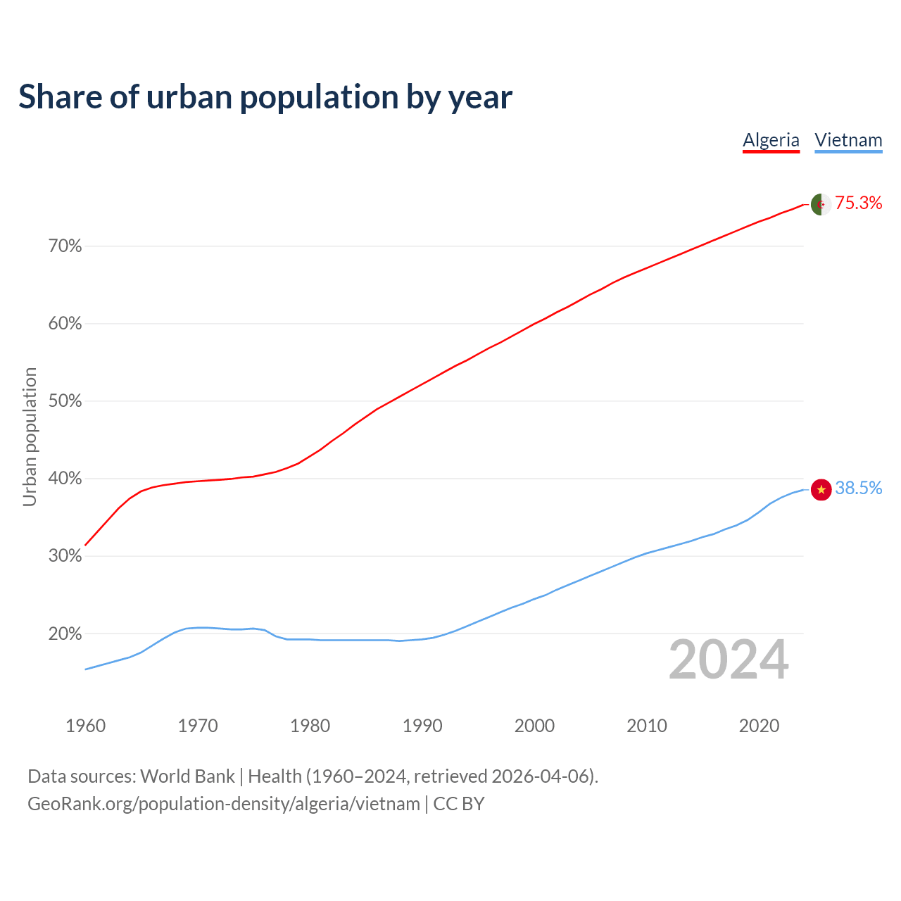 From 2004 to 2024, the share of urban population changed from 62.9% to 75.3% in Algeria and from 26.8% to 38.5% in Vietnam.