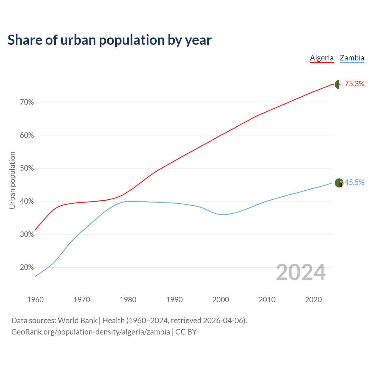 From 2004 to 2024, the share of urban population changed from 62.9% to 75.3% in Algeria and from 36.8% to 45.5% in Zambia.