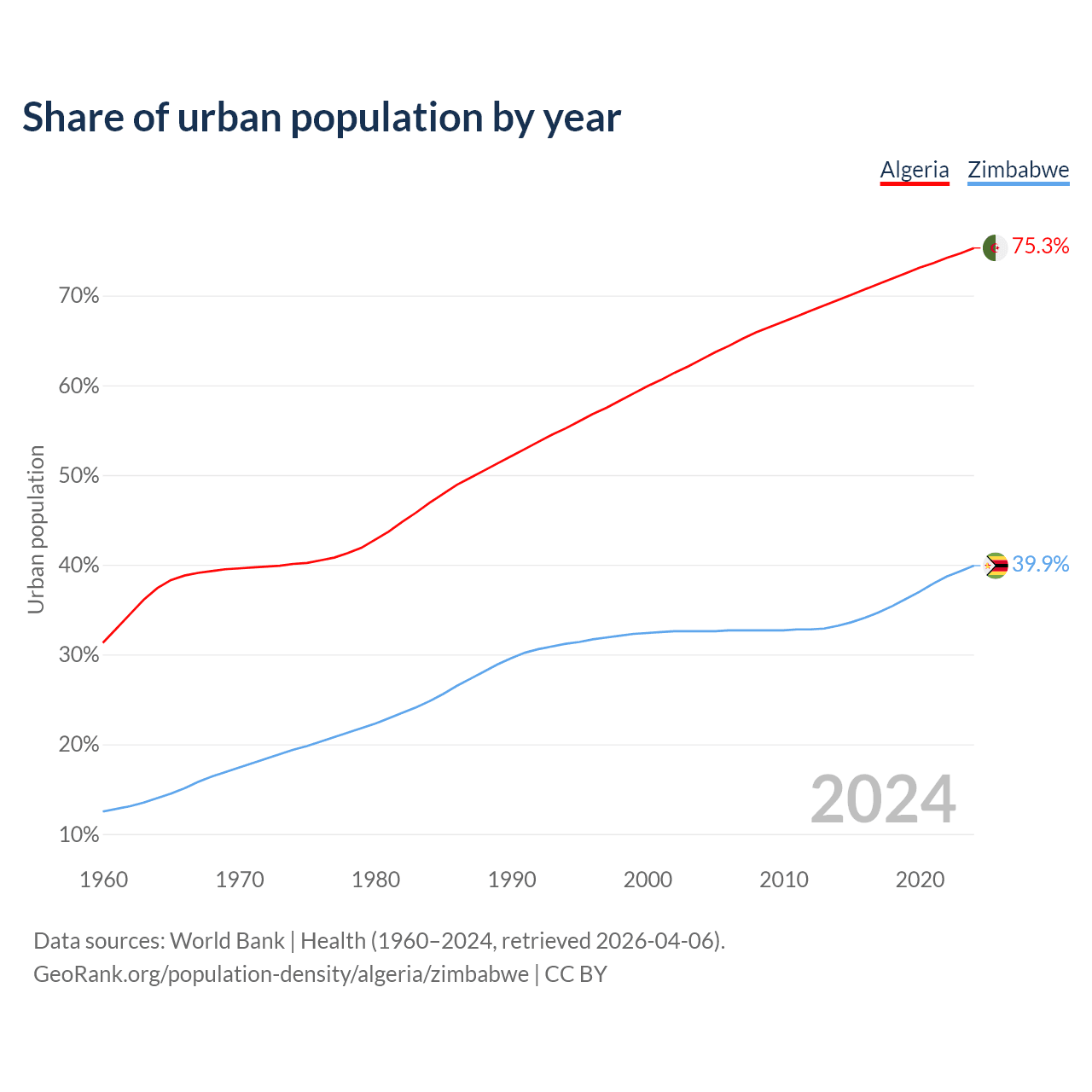 From 2004 to 2024, the share of urban population changed from 62.9% to 75.3% in Algeria and from 32.6% to 39.9% in Zimbabwe.