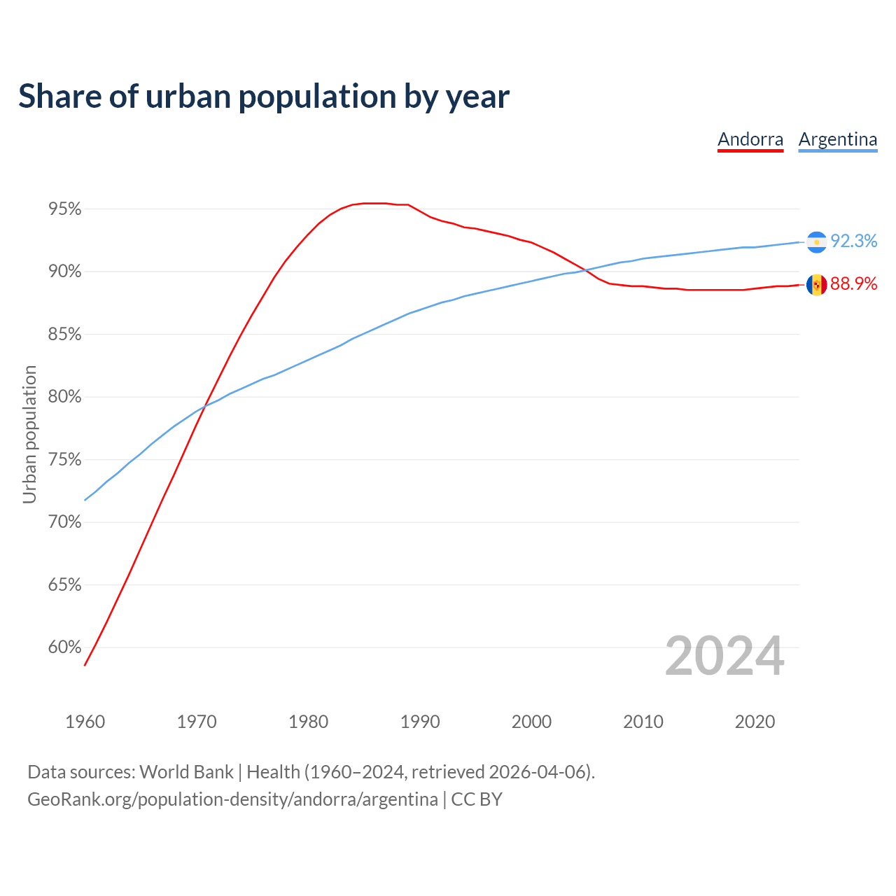 From 2004 to 2024, the share of urban population changed from 90.5% to 88.9% in Andorra and from 89.9% to 92.3% in Argentina.