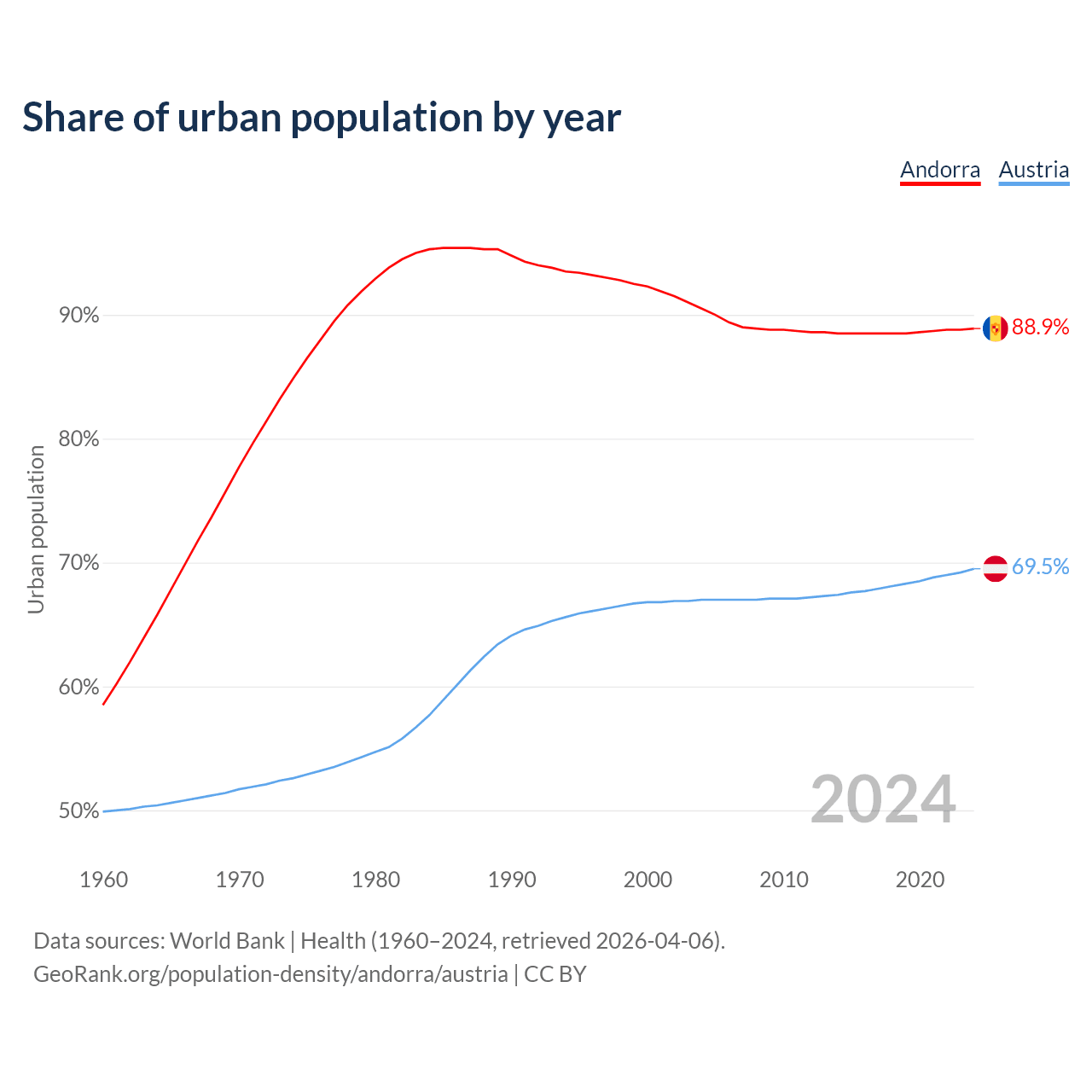 From 2004 to 2024, the share of urban population changed from 90.5% to 88.9% in Andorra and from 67% to 69.5% in Austria.