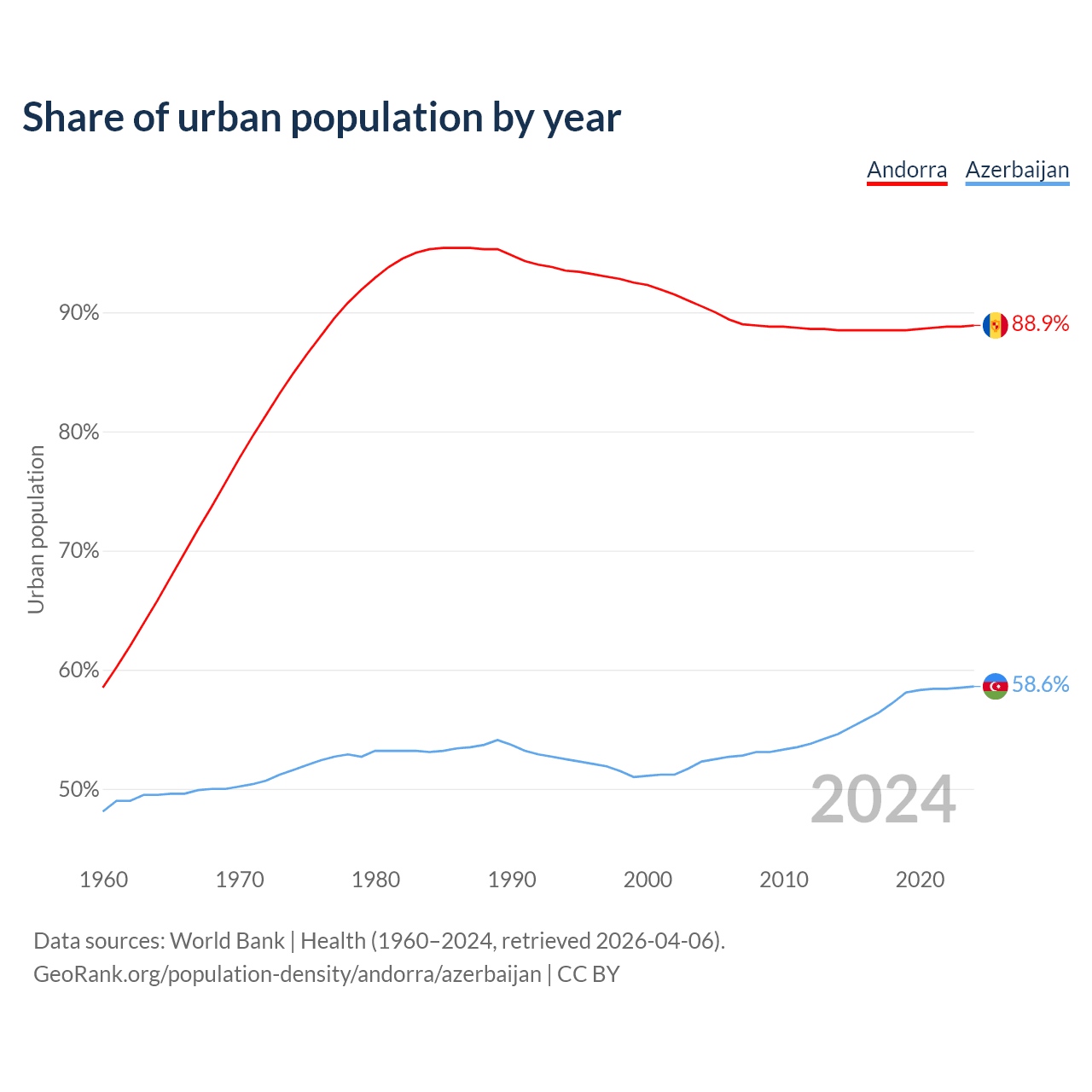 From 2004 to 2024, the share of urban population changed from 90.5% to 88.9% in Andorra and from 52.3% to 58.6% in Azerbaijan.