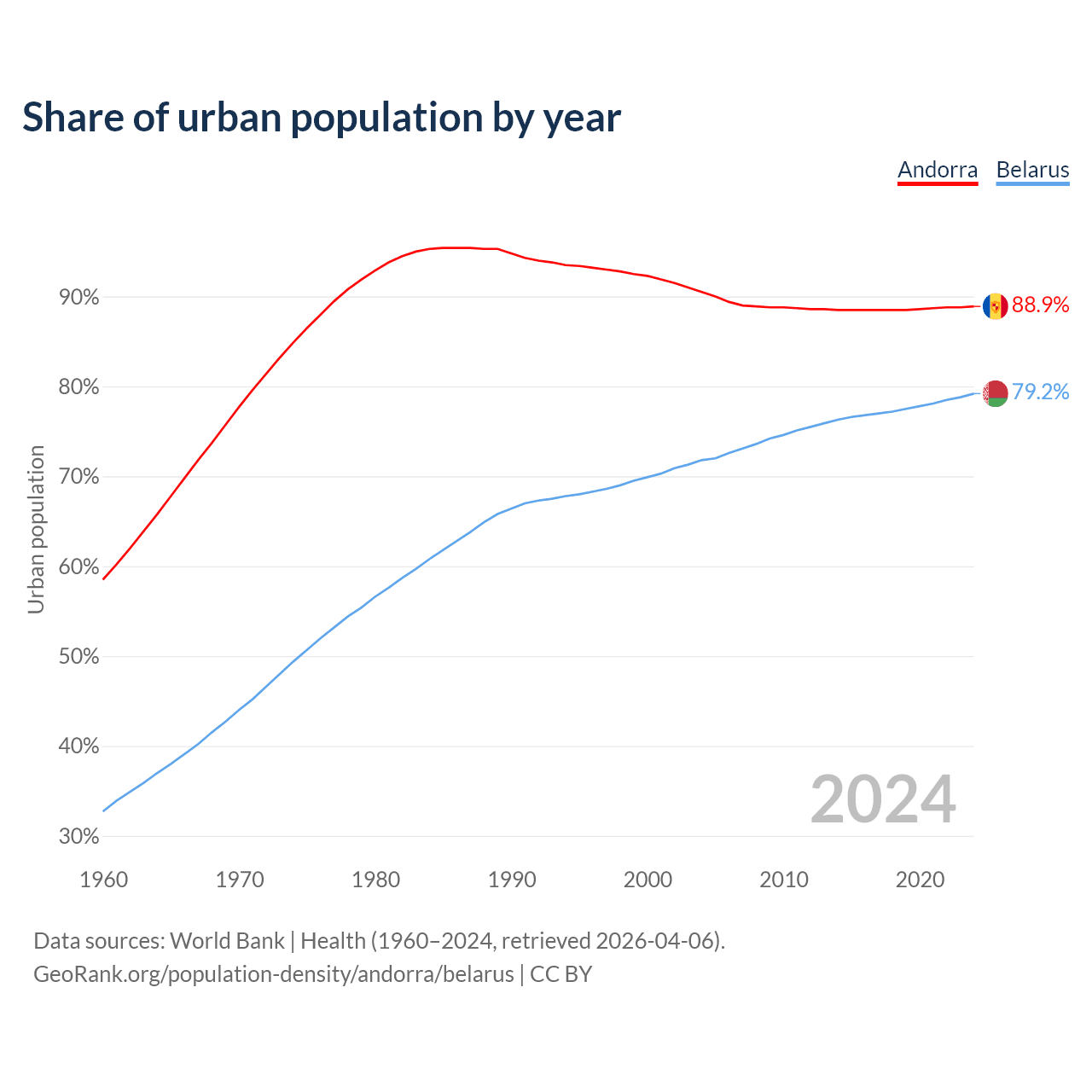 From 2004 to 2024, the share of urban population changed from 90.5% to 88.9% in Andorra and from 71.8% to 79.2% in Belarus.