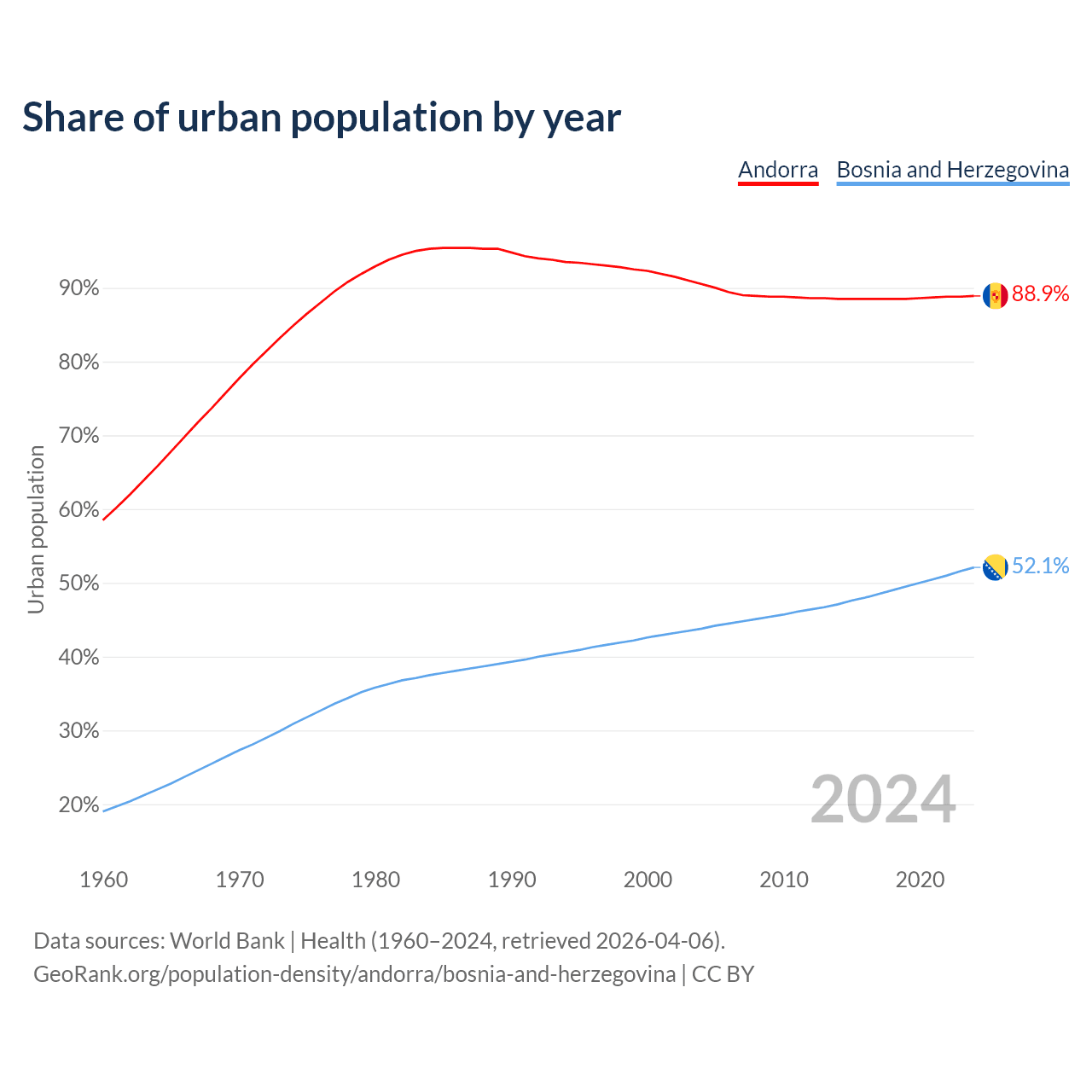 From 2004 to 2024, the share of urban population changed from 90.5% to 88.9% in Andorra and from 43.8% to 52.1% in Bosnia and Herzegovina.