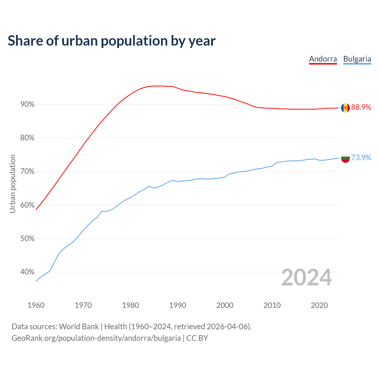 From 2004 to 2024, the share of urban population changed from 90.5% to 88.9% in Andorra and from 69.9% to 73.9% in Bulgaria.