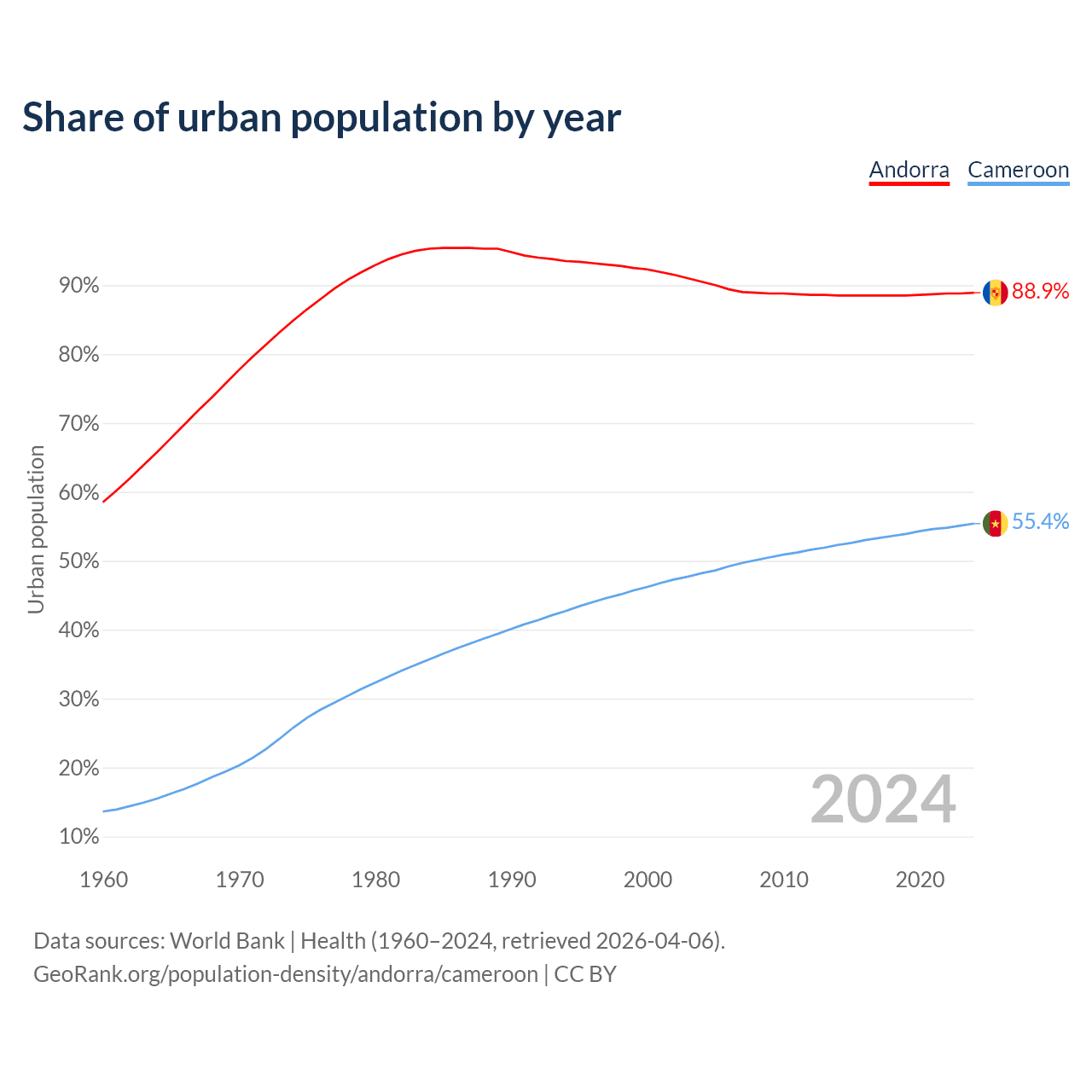 From 2004 to 2024, the share of urban population changed from 90.5% to 88.9% in Andorra and from 48.2% to 55.4% in Cameroon.