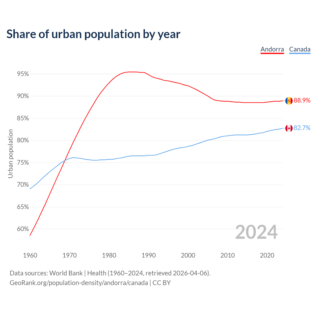 From 2004 to 2024, the share of urban population changed from 90.5% to 88.9% in Andorra and from 79.7% to 82.7% in Canada.