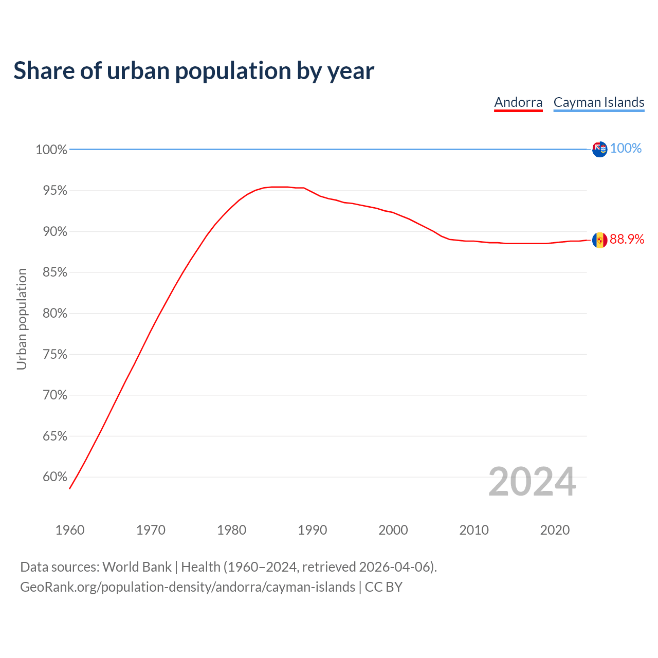 From 2004 to 2024, the share of urban population changed from 90.5% to 88.9% in Andorra and from 100% to 100% in the Cayman Islands.