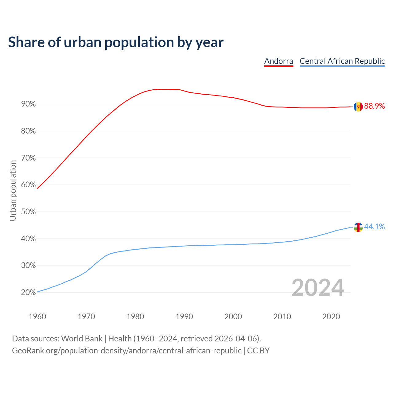 From 2004 to 2024, the share of urban population changed from 90.5% to 88.9% in Andorra and from 38% to 44.1% in the Central African Republic.