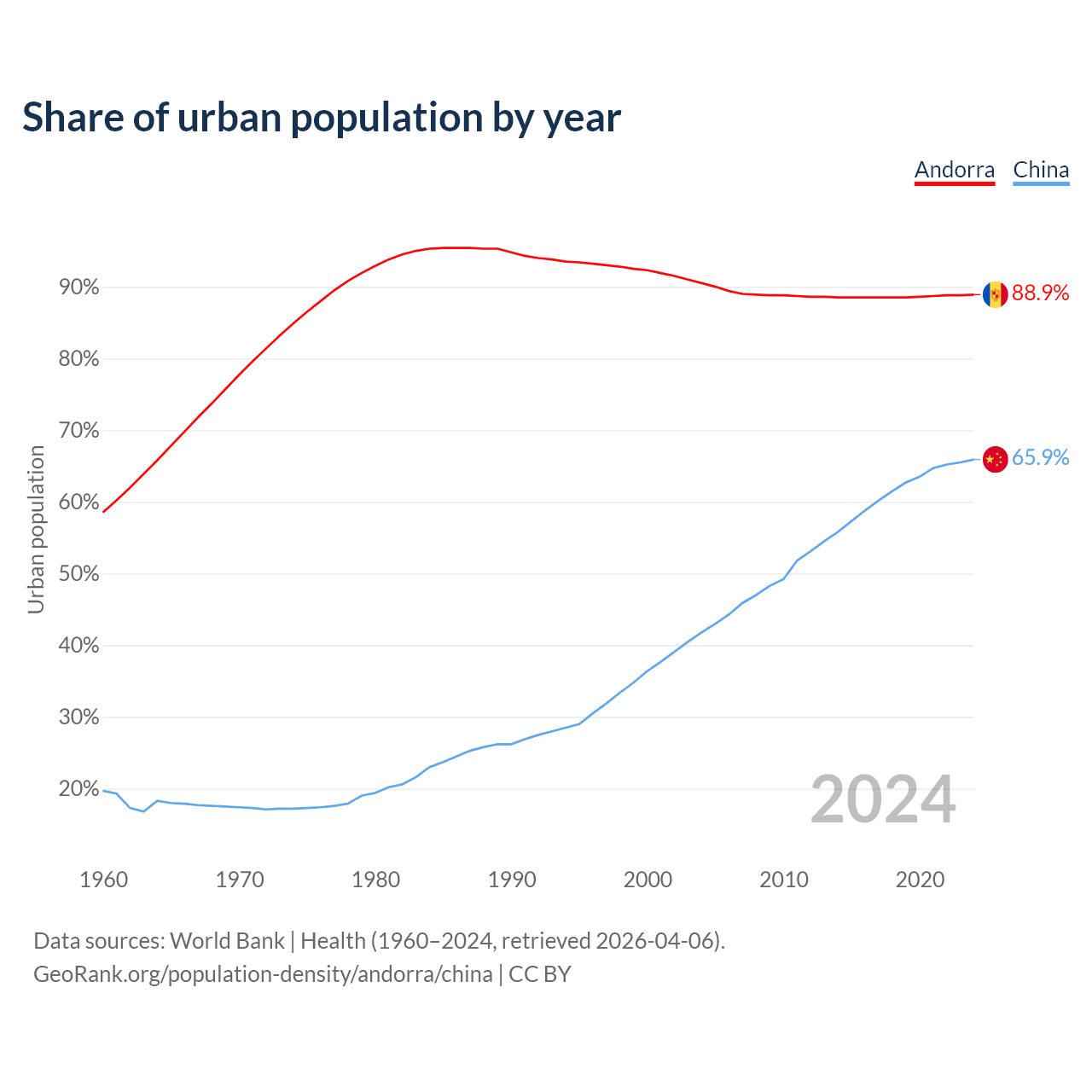 From 2004 to 2024, the share of urban population changed from 90.5% to 88.9% in Andorra and from 41.8% to 65.9% in China.