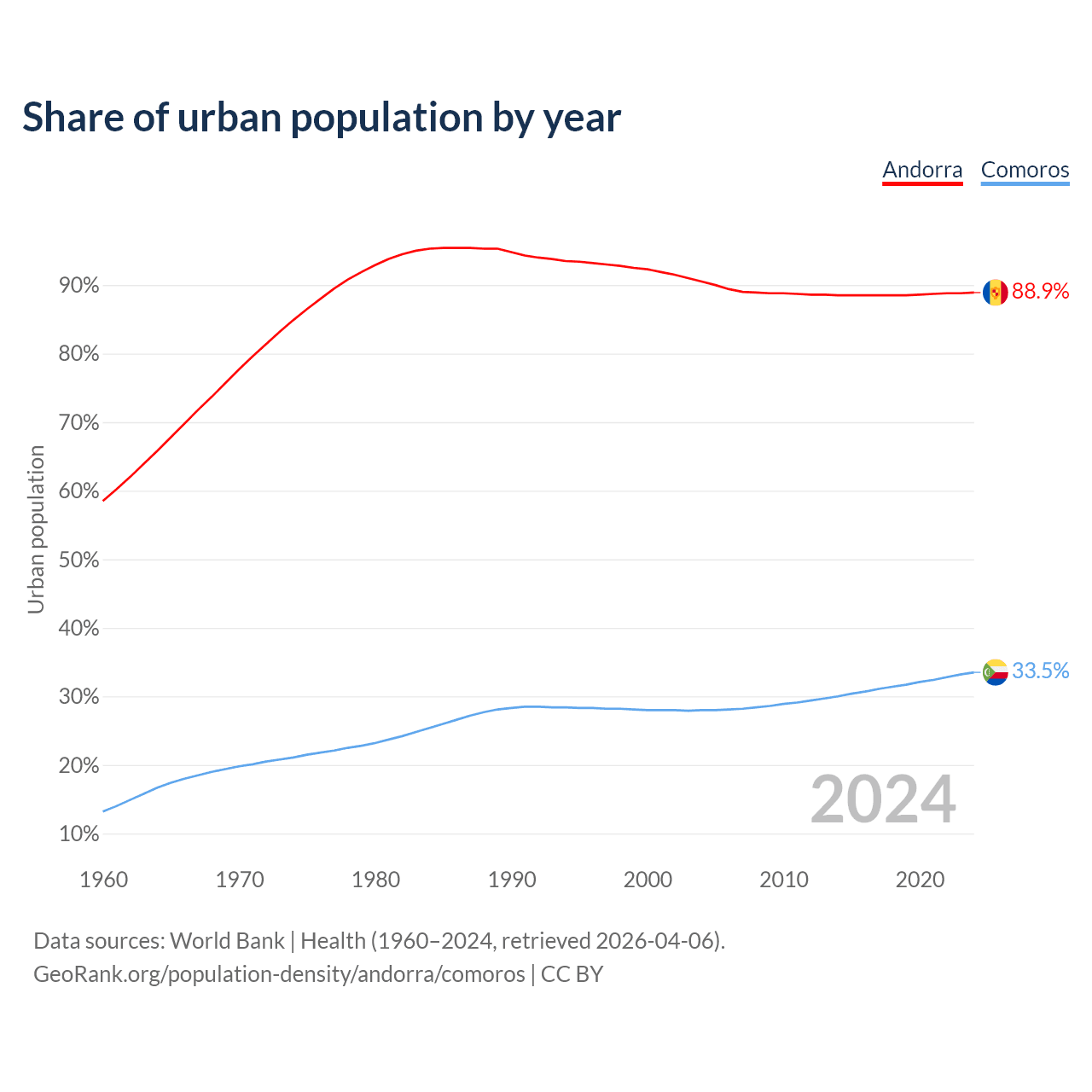 From 2004 to 2024, the share of urban population changed from 90.5% to 88.9% in Andorra and from 28% to 33.5% in Comoros.