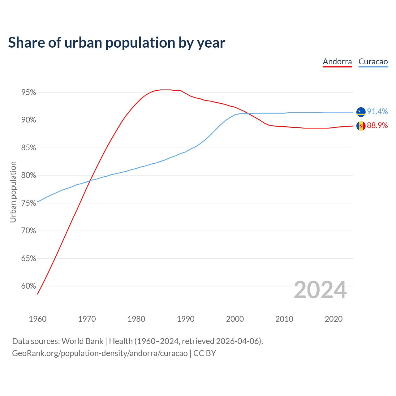 From 2004 to 2024, the share of urban population changed from 90.5% to 88.9% in Andorra and from 91.2% to 91.4% in Curacao.