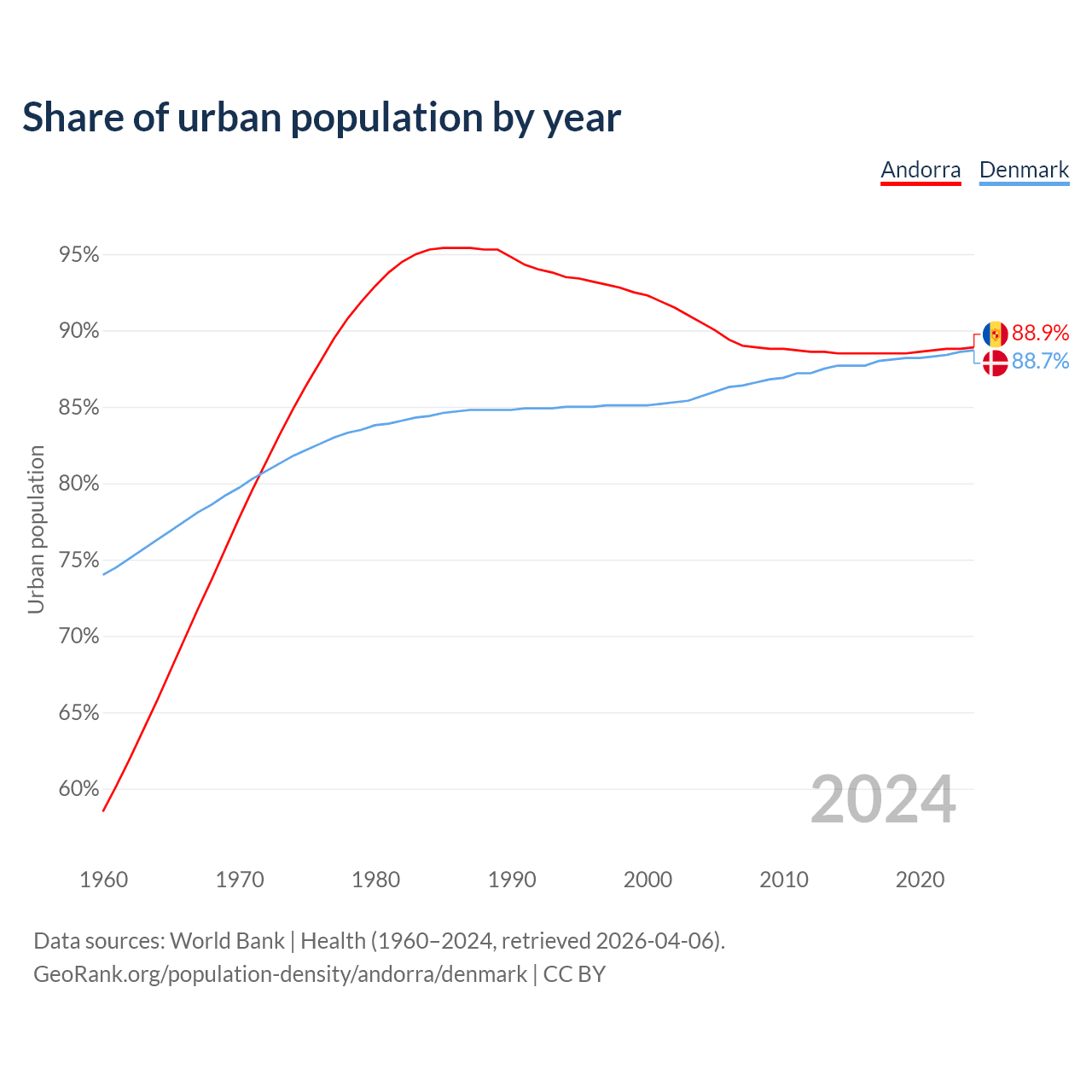 From 2004 to 2024, the share of urban population changed from 90.5% to 88.9% in Andorra and from 85.7% to 88.7% in Denmark.