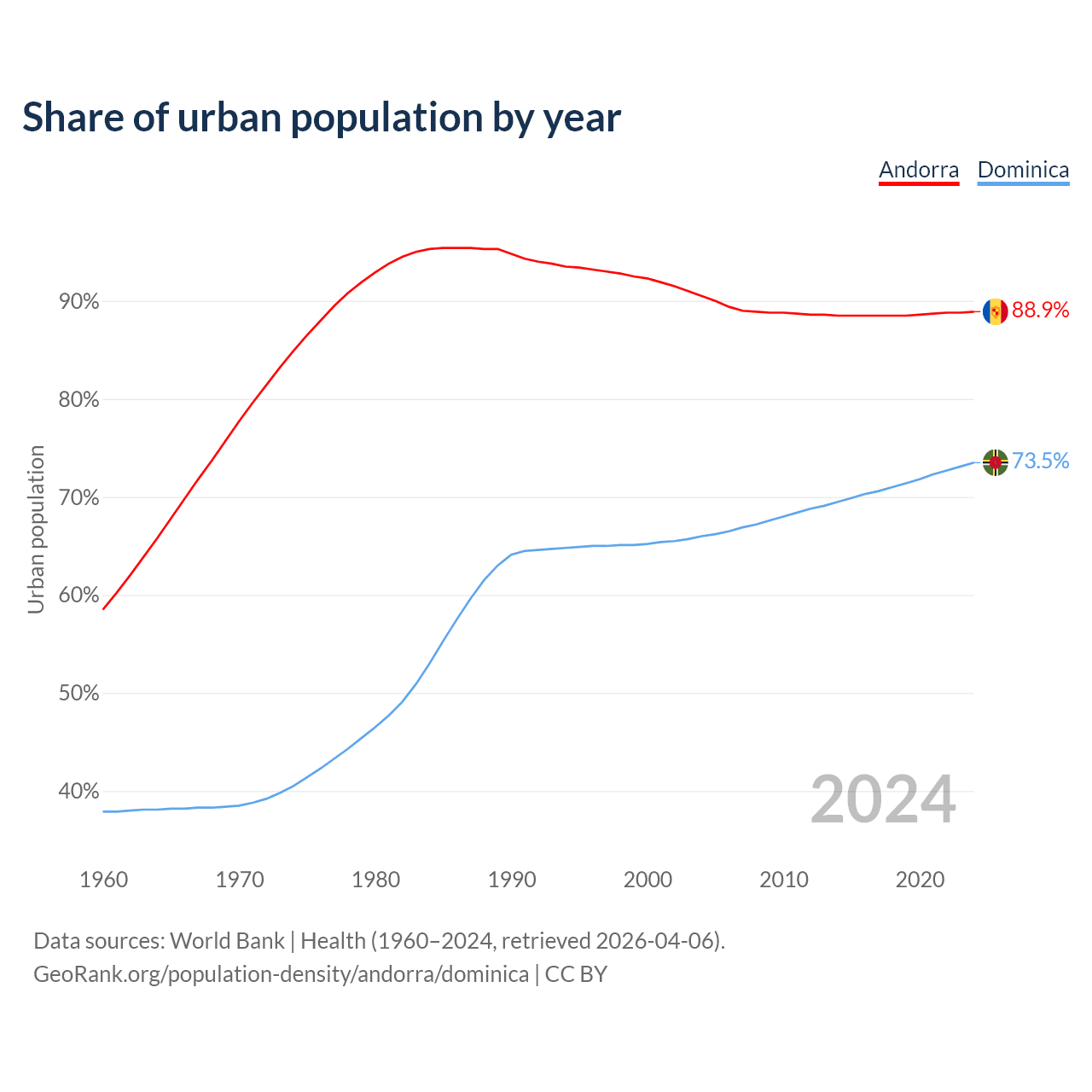 From 2004 to 2024, the share of urban population changed from 90.5% to 88.9% in Andorra and from 66% to 73.5% in Dominica.