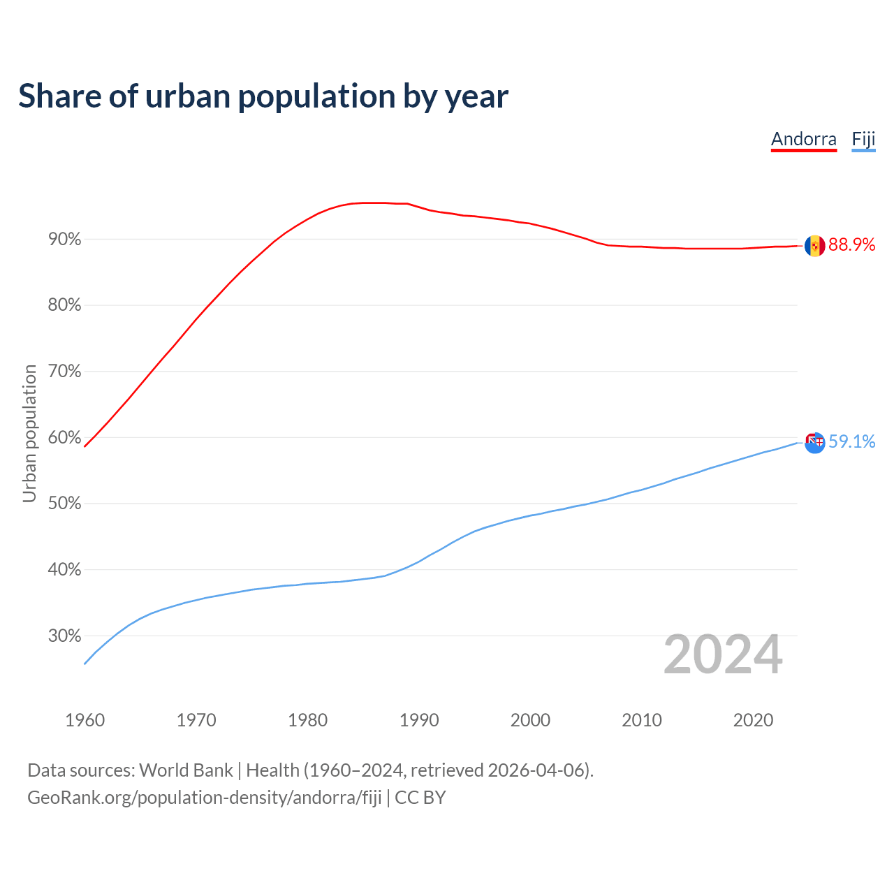 From 2004 to 2024, the share of urban population changed from 90.5% to 88.9% in Andorra and from 49.5% to 59.1% in Fiji.