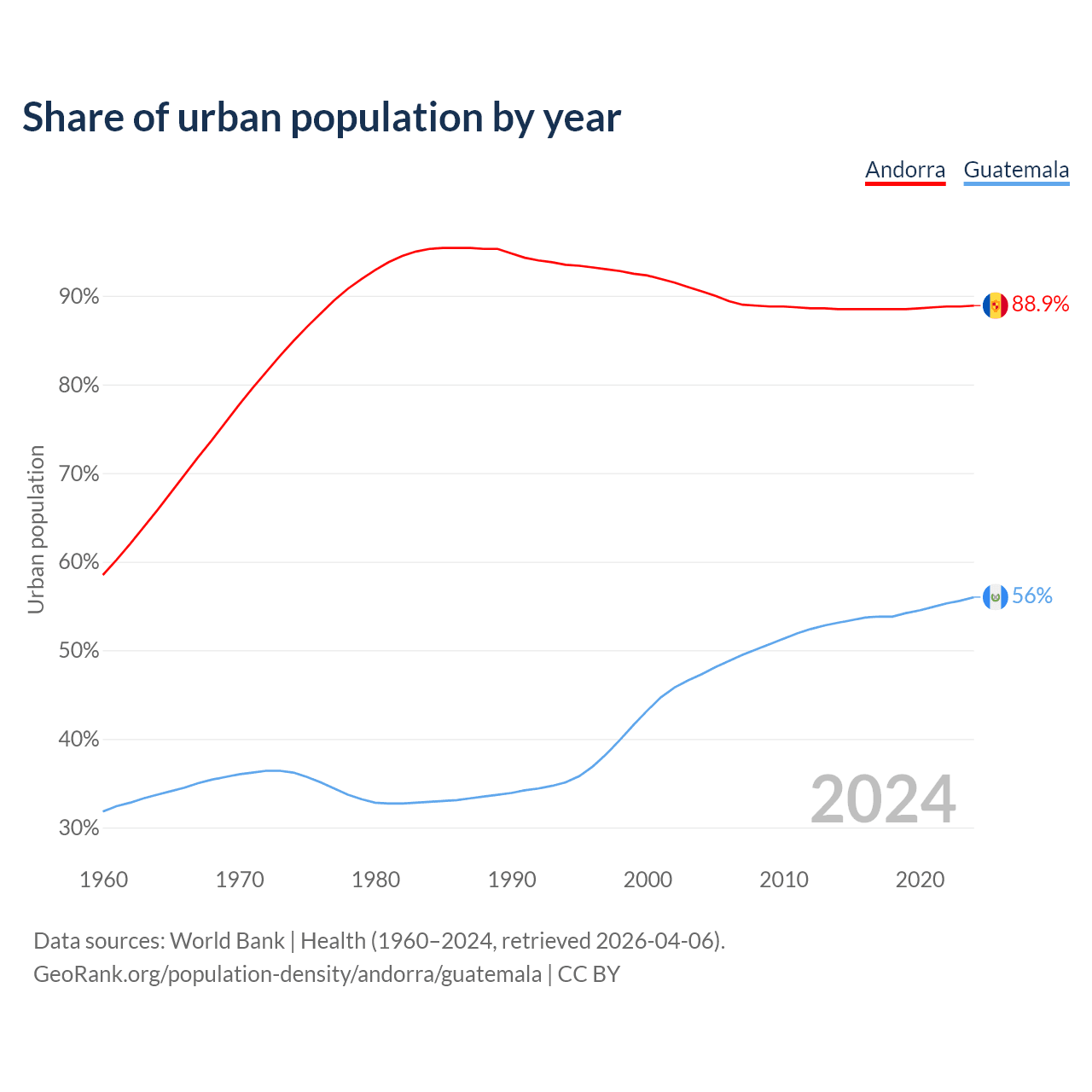 From 2004 to 2024, the share of urban population changed from 90.5% to 88.9% in Andorra and from 47.3% to 56% in Guatemala.