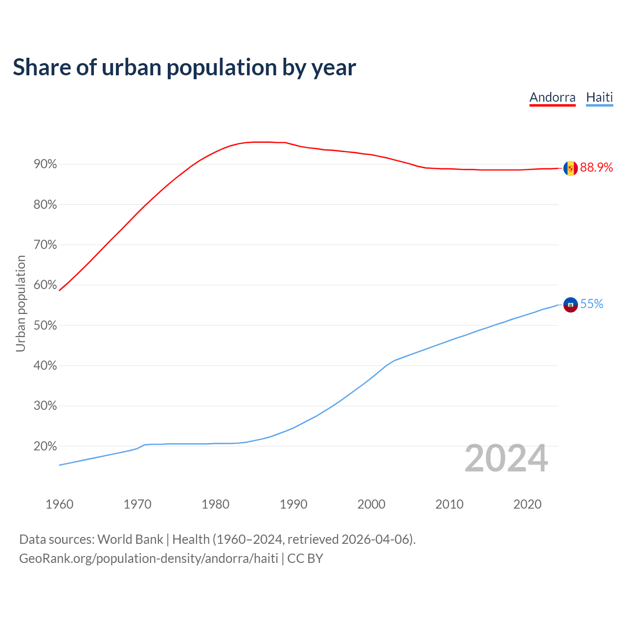 From 2004 to 2024, the share of urban population changed from 90.5% to 88.9% in Andorra and from 41.9% to 55% in Haiti.