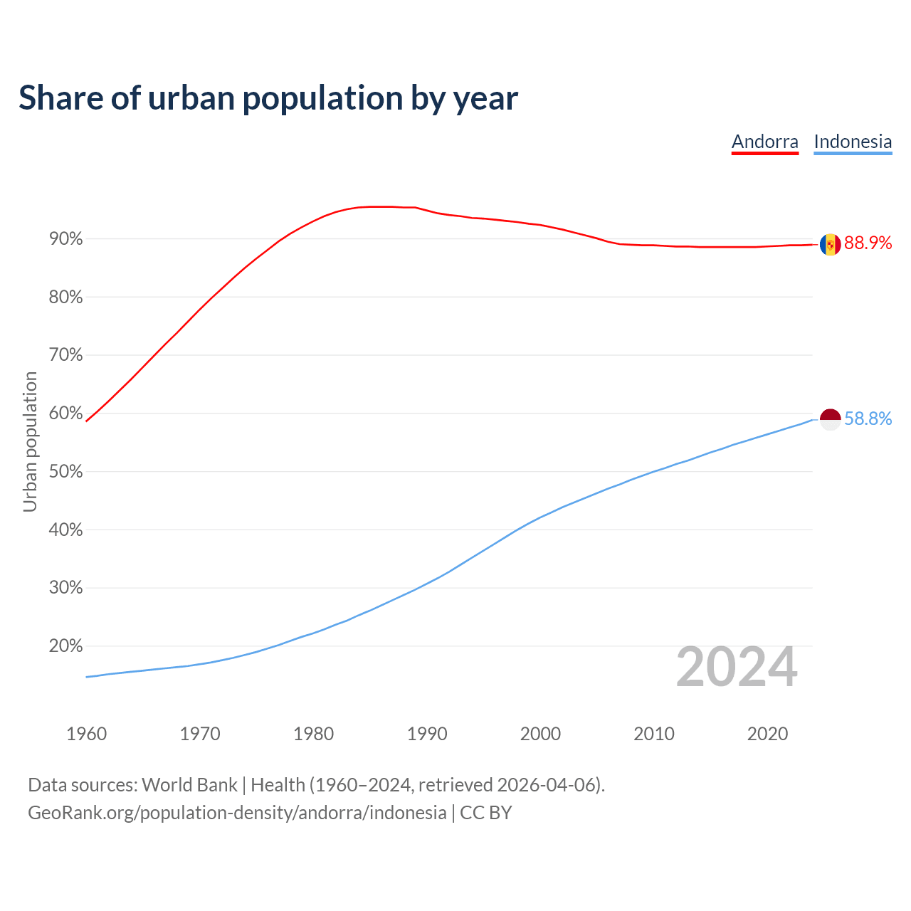 From 2004 to 2024, the share of urban population changed from 90.5% to 88.9% in Andorra and from 45.4% to 58.8% in Indonesia.