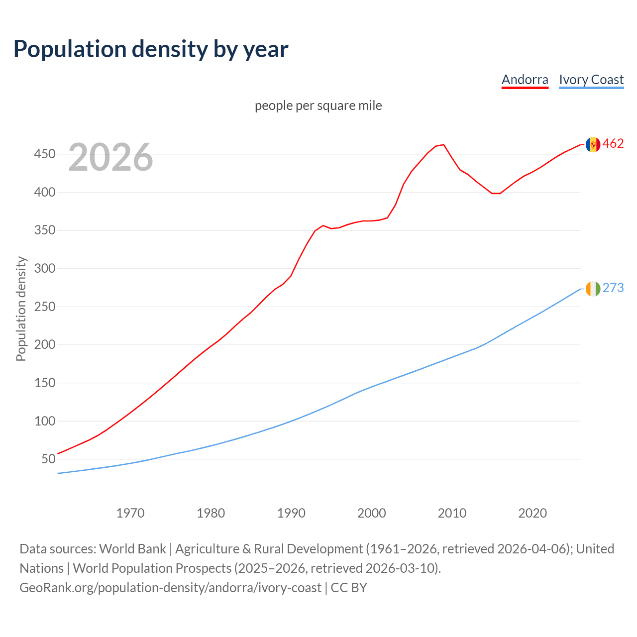 From 2006 to 2026, population density in Andorra increased by 5.4%, compared to a 63.1% growth in Ivory Coast.