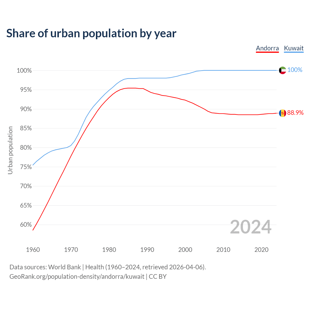 From 2004 to 2024, the share of urban population changed from 90.5% to 88.9% in Andorra and from 99.9% to 100% in Kuwait.