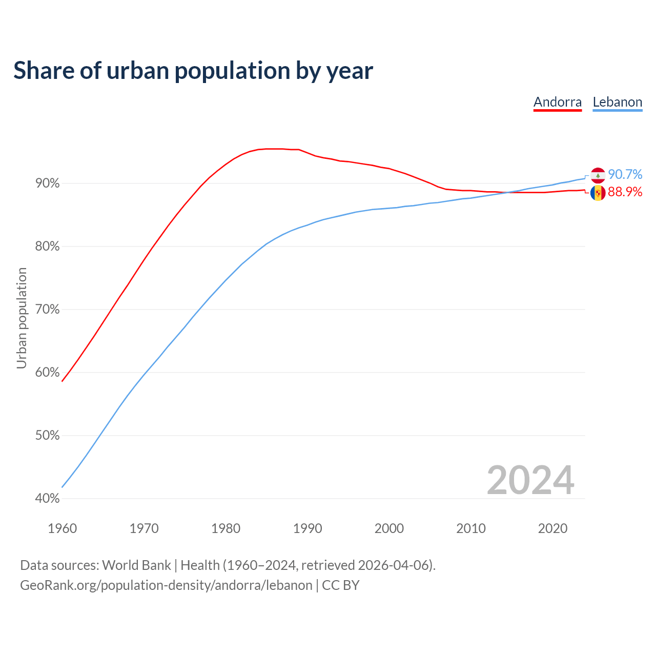 From 2004 to 2024, the share of urban population changed from 90.5% to 88.9% in Andorra and from 86.6% to 90.7% in Lebanon.