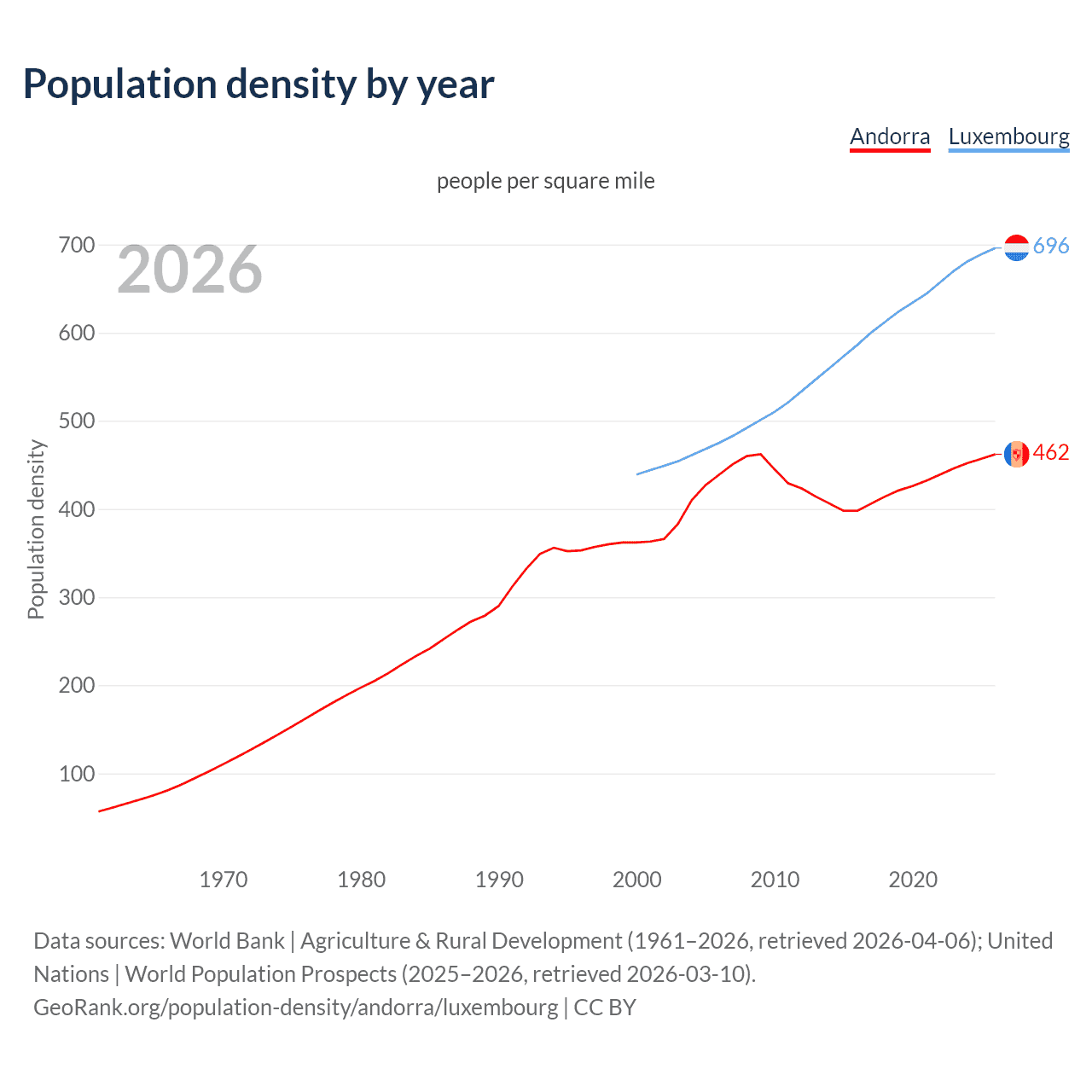 From 2006 to 2026, population density in Andorra increased by 5.4%, compared to a 46.4% growth in Luxembourg.