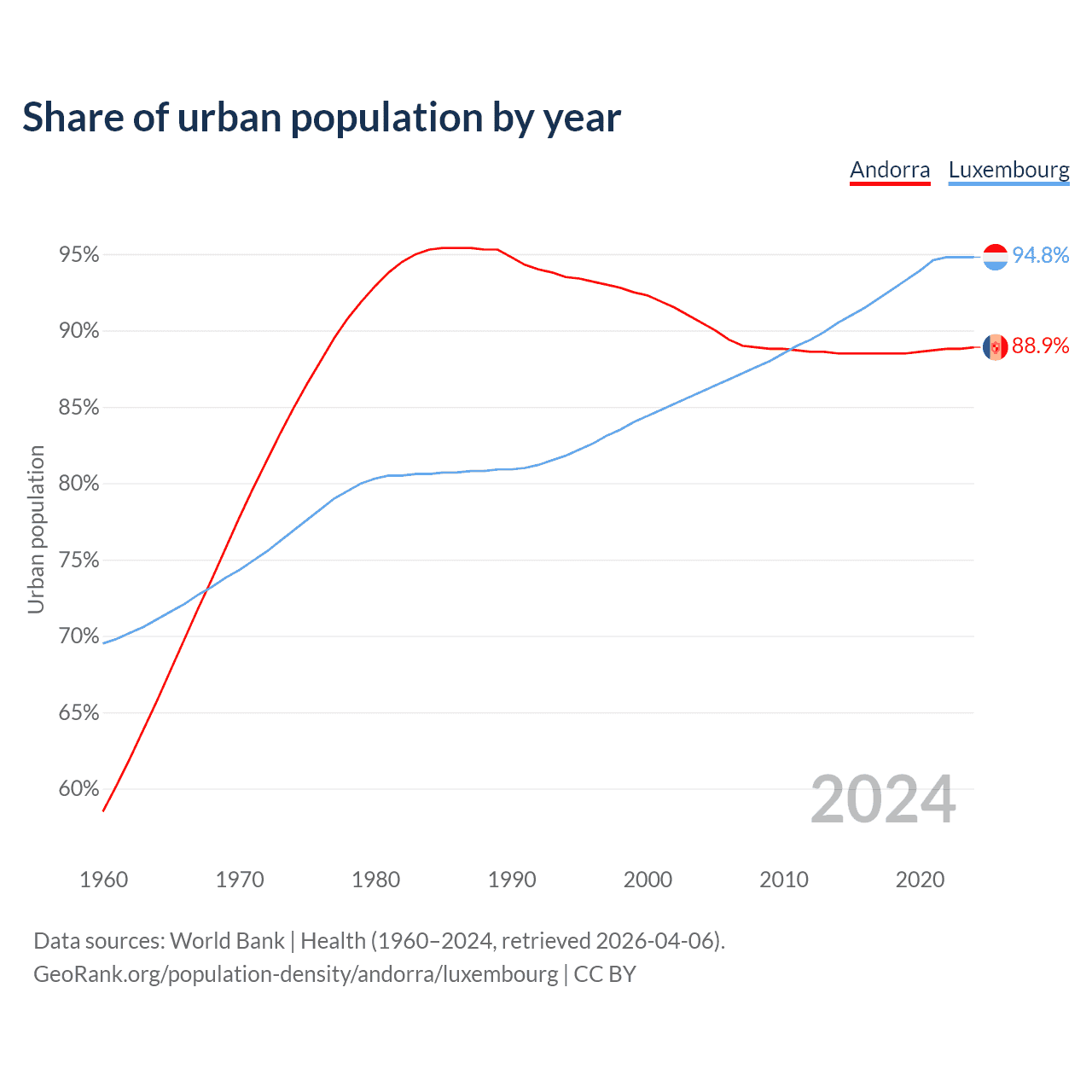 From 2004 to 2024, the share of urban population changed from 90.5% to 88.9% in Andorra and from 86% to 94.8% in Luxembourg.