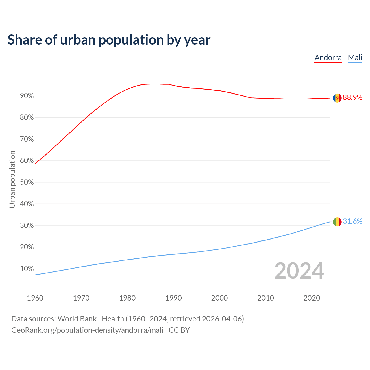 From 2004 to 2024, the share of urban population changed from 90.5% to 88.9% in Andorra and from 20.5% to 31.6% in Mali.