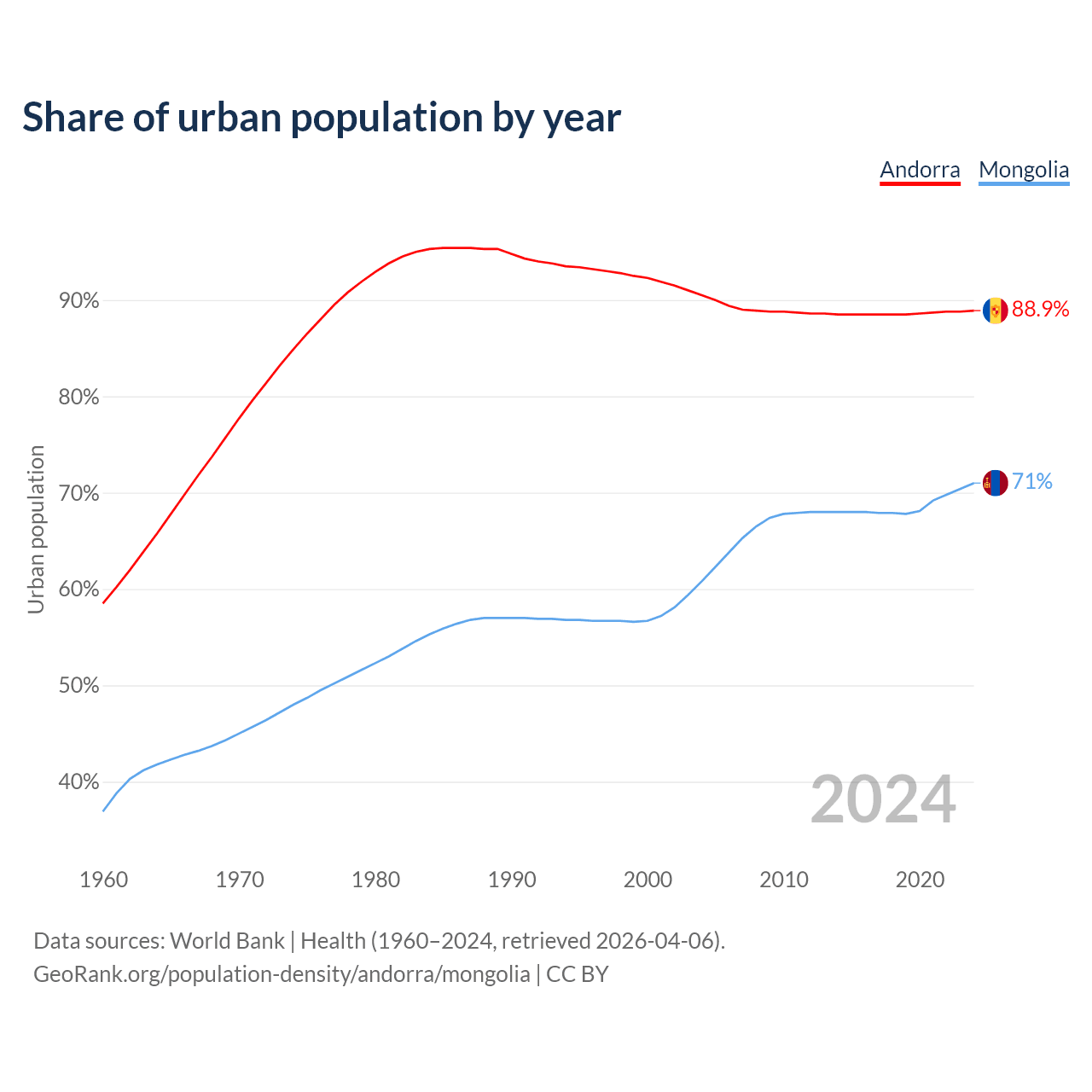 From 2004 to 2024, the share of urban population changed from 90.5% to 88.9% in Andorra and from 60.8% to 71% in Mongolia.