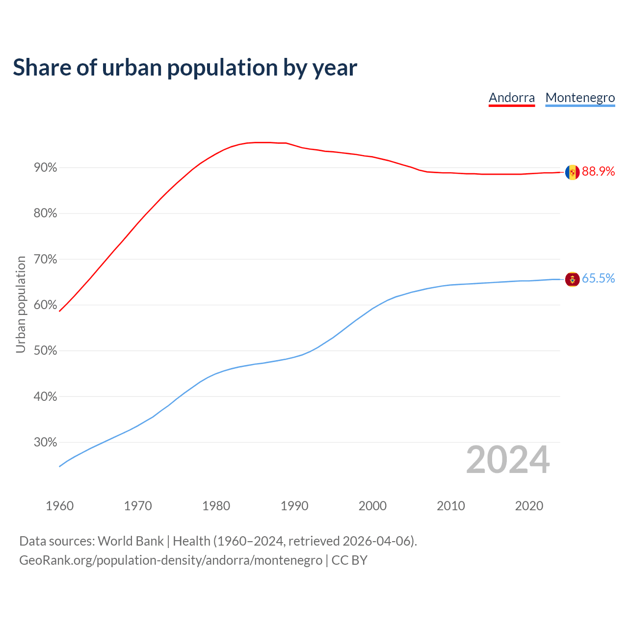From 2004 to 2024, the share of urban population changed from 90.5% to 88.9% in Andorra and from 62.2% to 65.5% in Montenegro.