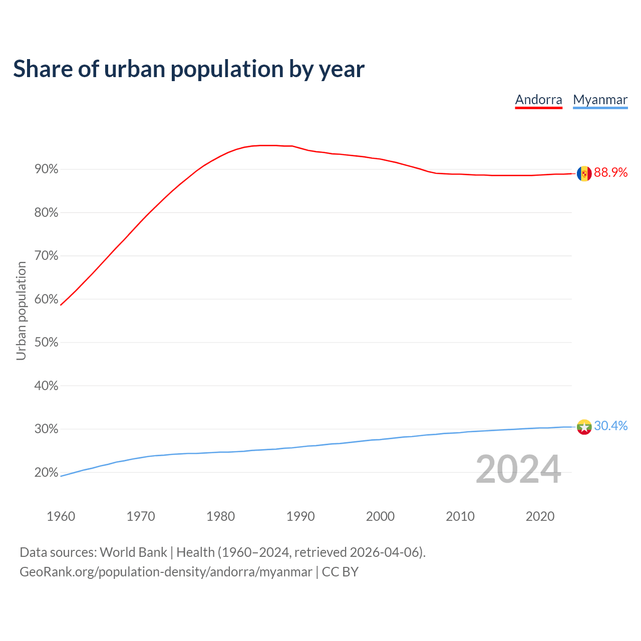 From 2004 to 2024, the share of urban population changed from 90.5% to 88.9% in Andorra and from 28.2% to 30.4% in Myanmar.
