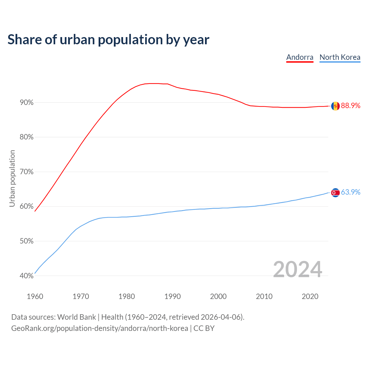 From 2004 to 2024, the share of urban population changed from 90.5% to 88.9% in Andorra and from 59.7% to 63.9% in North Korea.