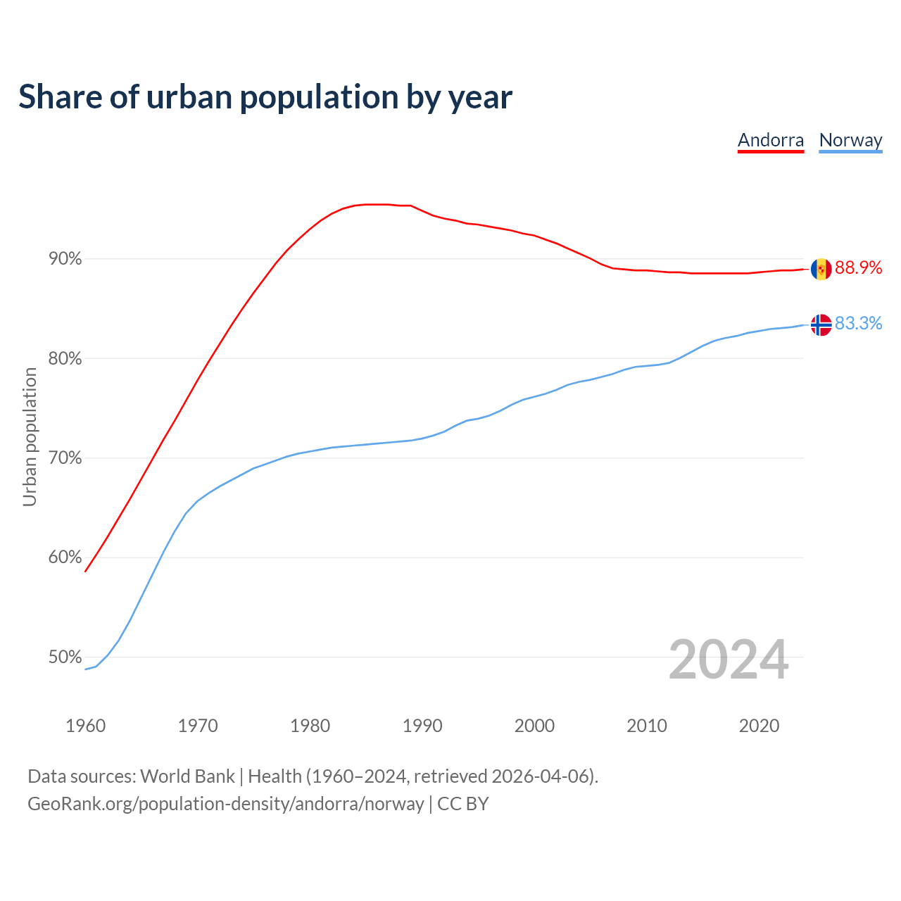 From 2004 to 2024, the share of urban population changed from 90.5% to 88.9% in Andorra and from 77.6% to 83.3% in Norway.