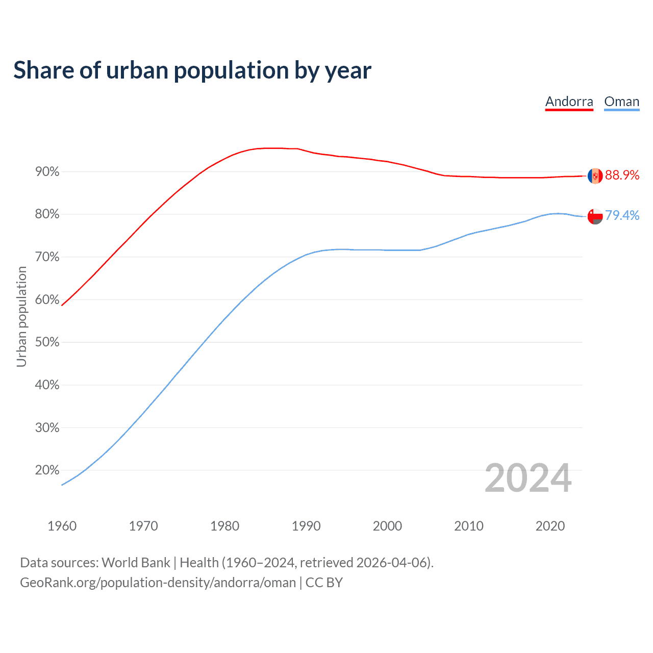 From 2004 to 2024, the share of urban population changed from 90.5% to 88.9% in Andorra and from 71.5% to 79.4% in Oman.