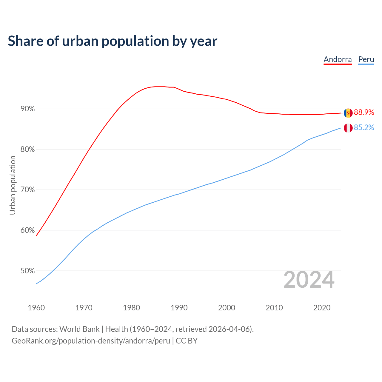 From 2004 to 2024, the share of urban population changed from 90.5% to 88.9% in Andorra and from 74.4% to 85.2% in Peru.