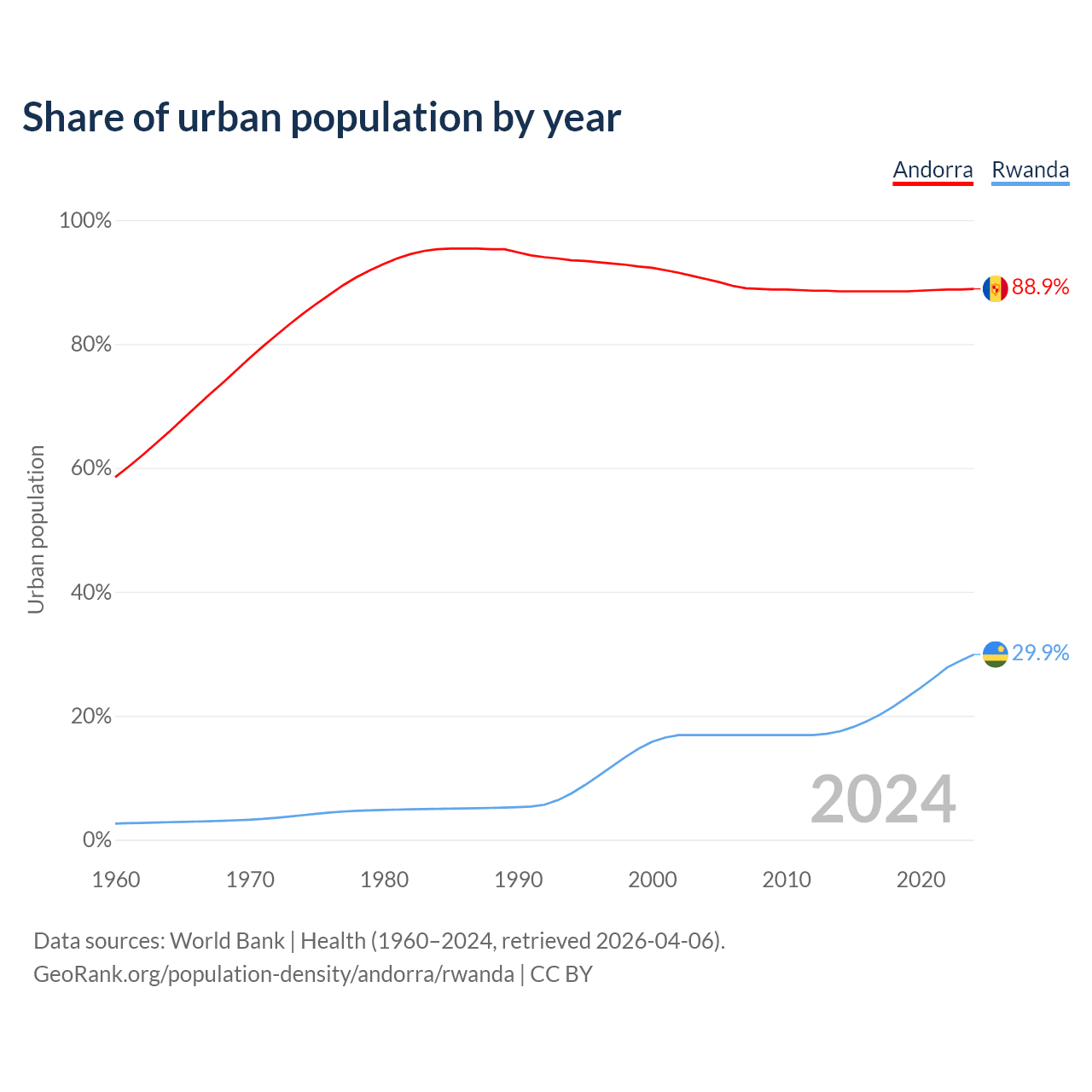 From 2004 to 2024, the share of urban population changed from 90.5% to 88.9% in Andorra and from 16.9% to 29.9% in Rwanda.