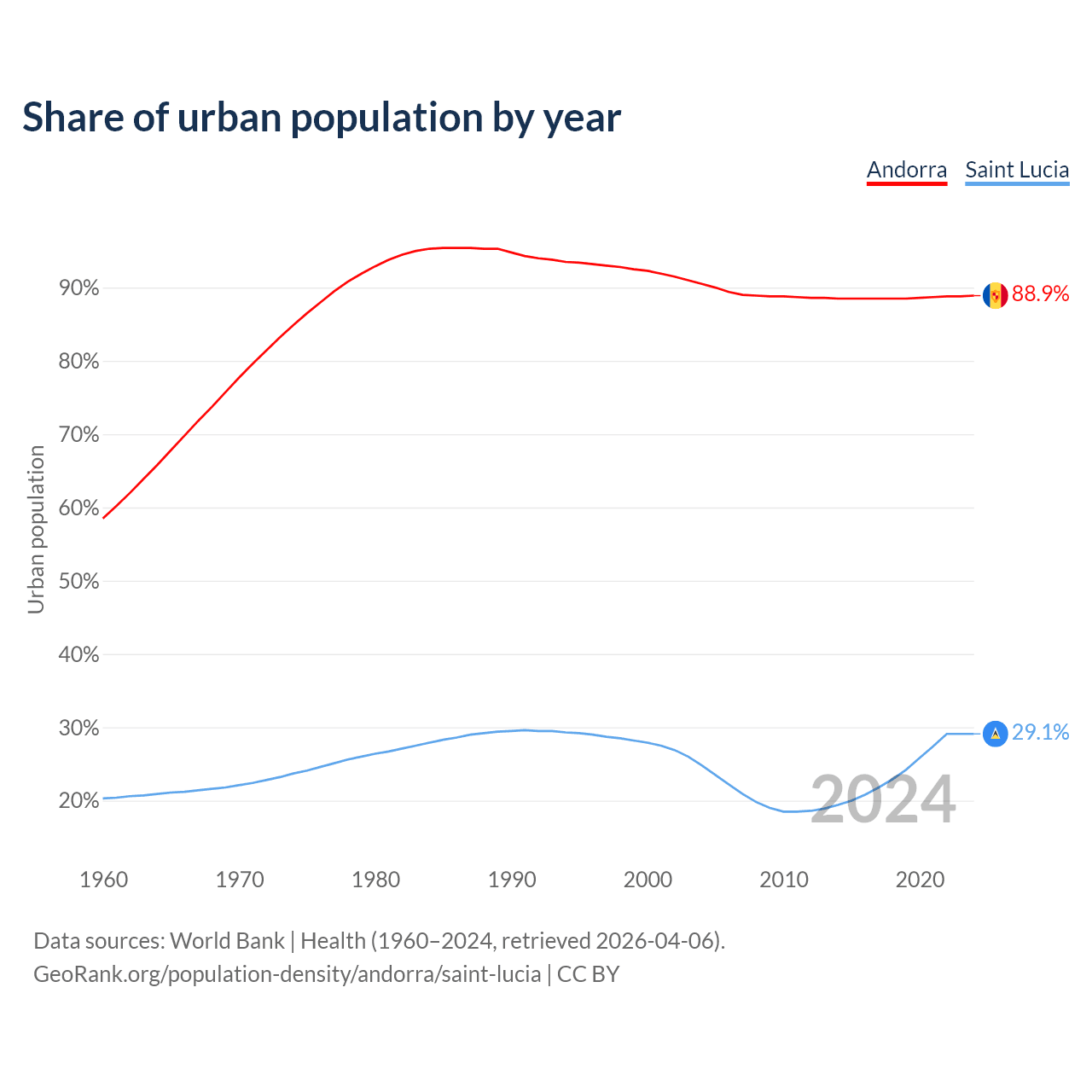 From 2004 to 2024, the share of urban population changed from 90.5% to 88.9% in Andorra and from 24.8% to 29.1% in Saint Lucia.