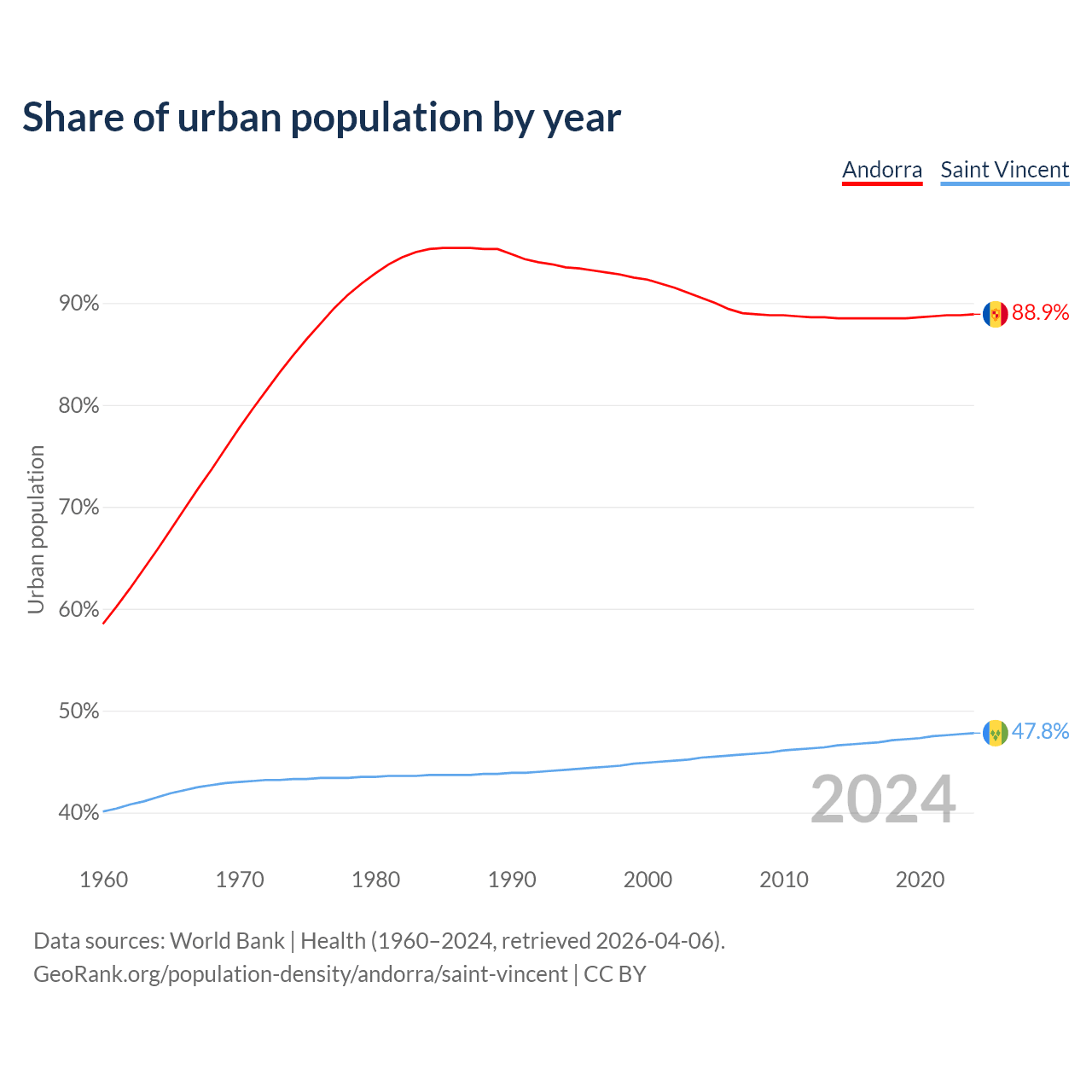 From 2004 to 2024, the share of urban population changed from 90.5% to 88.9% in Andorra and from 45.4% to 47.8% in Saint Vincent.