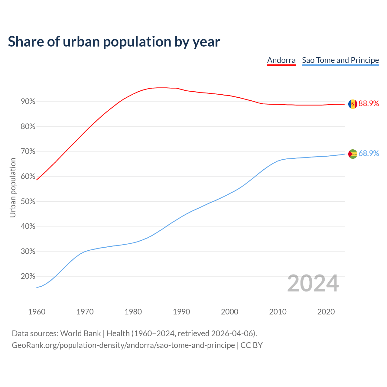 From 2004 to 2024, the share of urban population changed from 90.5% to 88.9% in Andorra and from 57.9% to 68.9% in Sao Tome and Principe.