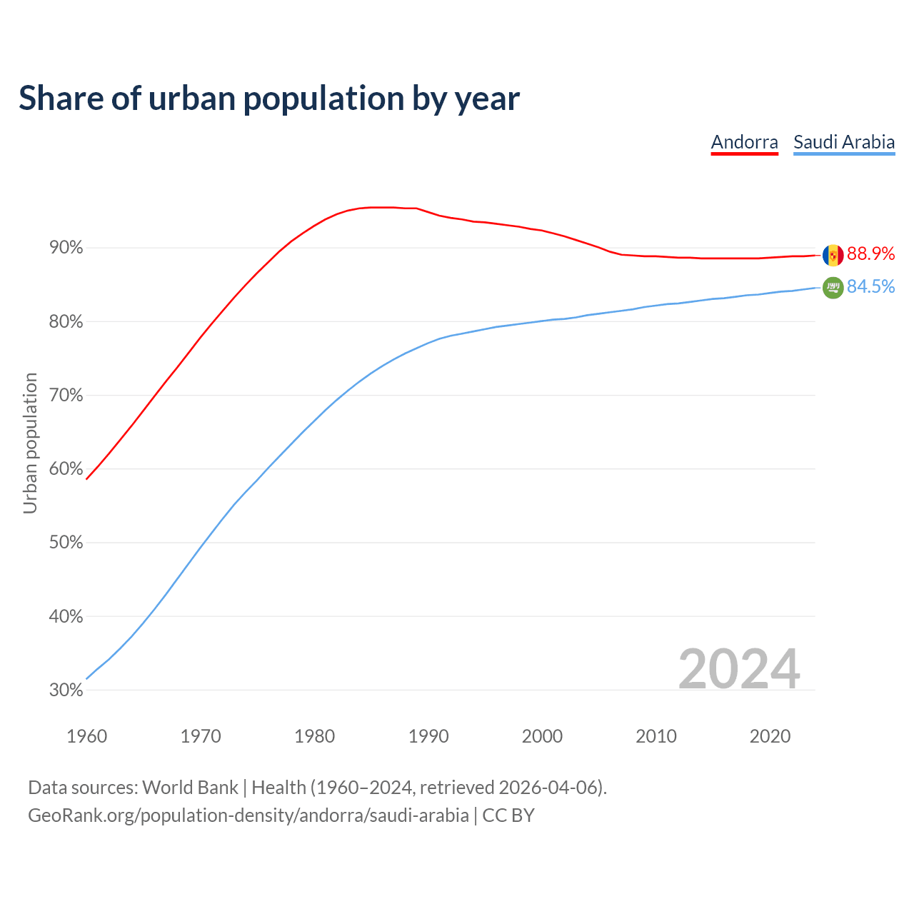 From 2004 to 2024, the share of urban population changed from 90.5% to 88.9% in Andorra and from 80.8% to 84.5% in Saudi Arabia.