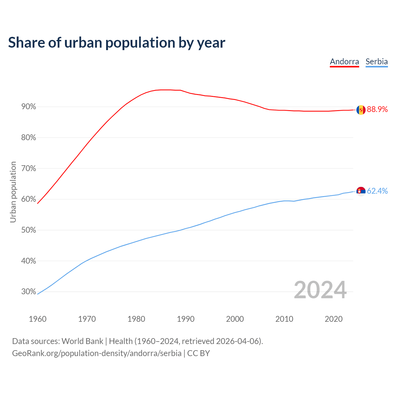 From 2004 to 2024, the share of urban population changed from 90.5% to 88.9% in Andorra and from 57.3% to 62.4% in Serbia.