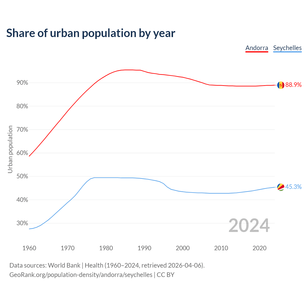 From 2004 to 2024, the share of urban population changed from 90.5% to 88.9% in Andorra and from 42.9% to 45.3% in the Seychelles.