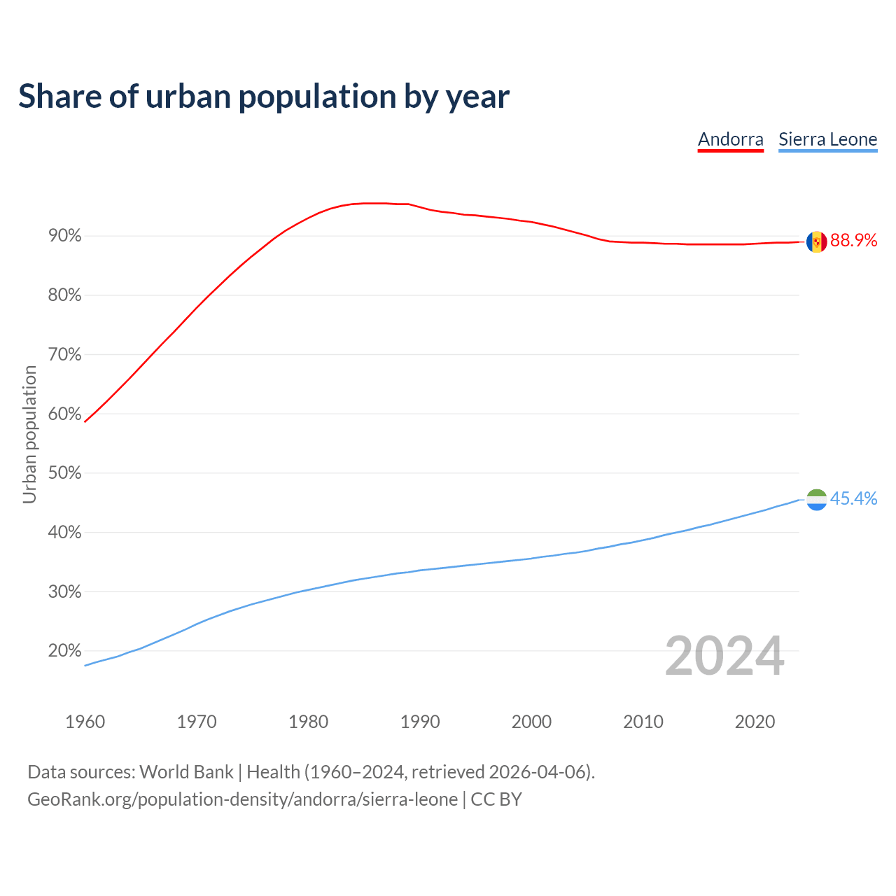 From 2004 to 2024, the share of urban population changed from 90.5% to 88.9% in Andorra and from 36.5% to 45.4% in Sierra Leone.