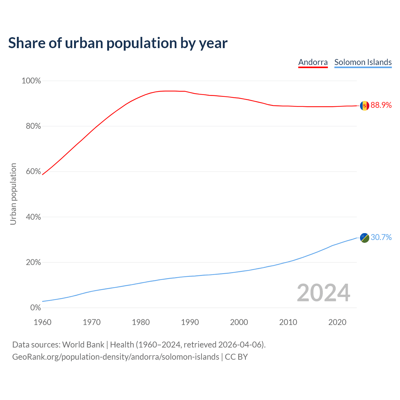 From 2004 to 2024, the share of urban population changed from 90.5% to 88.9% in Andorra and from 17.2% to 30.7% in the Solomon Islands.