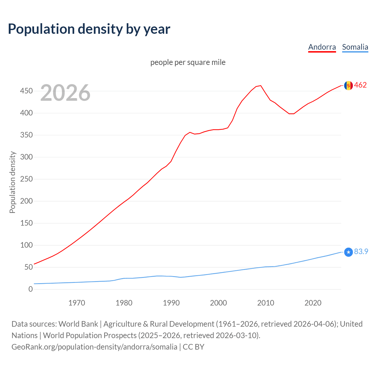 From 2006 to 2026, population density in Andorra increased by 5.4%, compared to a 85.2% growth in Somalia.